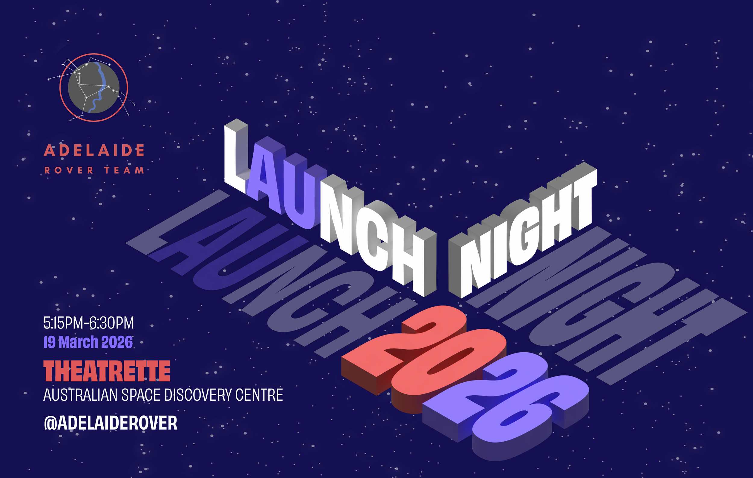 Launch Night 2026 Thursday 19 March 2026 5:15 pm 6:30 pm Theatrette Australian Space Discovery Centre Adelaide, SA, 5000 Australia (map) Google Calendar ICS Wondering what the Team has been up to? Drop by the Launch Night at Theatrette at the Australian Space Discovery Centre from 5:15PM to 6:30PM to find out more! Don’t forget to sign up using the link below!